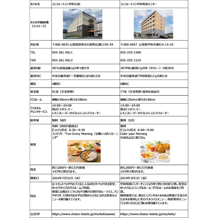 また、この度ホテル名称を変更する「コンフォートイン甲府昭和インター」(変更前:コンフォートイン甲府)は中央自動車道「甲府昭和IC」から車で約1分、山梨県内を中心としたビジネスや観光の拠点に便利にご利用いただけます。