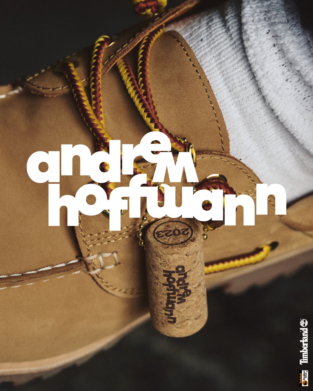 『andreM hoffwann』との別注は、2024年9月以来2度目となります。前回は「スリーアイ クラシック ラグ」のハイカットモデルである「セブンアイ クラシック ラグ」の別注でしたが、今回は定番のスリーアイモデルをベースに採用しました。アッパーには「6インチ プレミアム ウォータープルーフ ブーツ(通称:イエローブーツ)」と同じイエローヌバックレザーを用い、シューレースも「イエローブーツ」と同様のタイプにすることで、2つのアイコンモデルの高次元での融合を実現しています。また、インソールはダブルネーム仕様となっているほか、今回のためだけにデザインされた両者のロゴ刻印入りワインのコルクチャームが付属します。