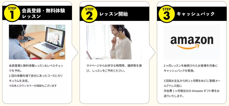 英語力アップのためには、継続・習慣化がポイント。みなさまの英語力アップ、英語学習の継続・習慣化へのモチベーションを高めていただくきっかけとして、英会話レッスンを2ヶ月継続するとレッスン料金の1ヶ月分相当をAmazonギフト券でキャッシュバックいたします。