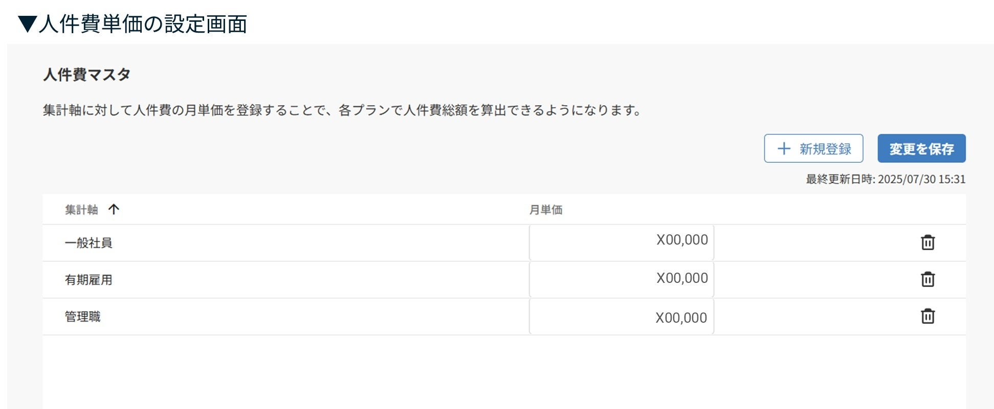 各部門がCTM2.0上で提出した人員数と、人件費単価を掛け合わせ、部門別や全社の人件費を自動で計算します。単価は、社員区分・資格等級・部門など、各社のルールに合わせた区分ごとに柔軟に設定できます。