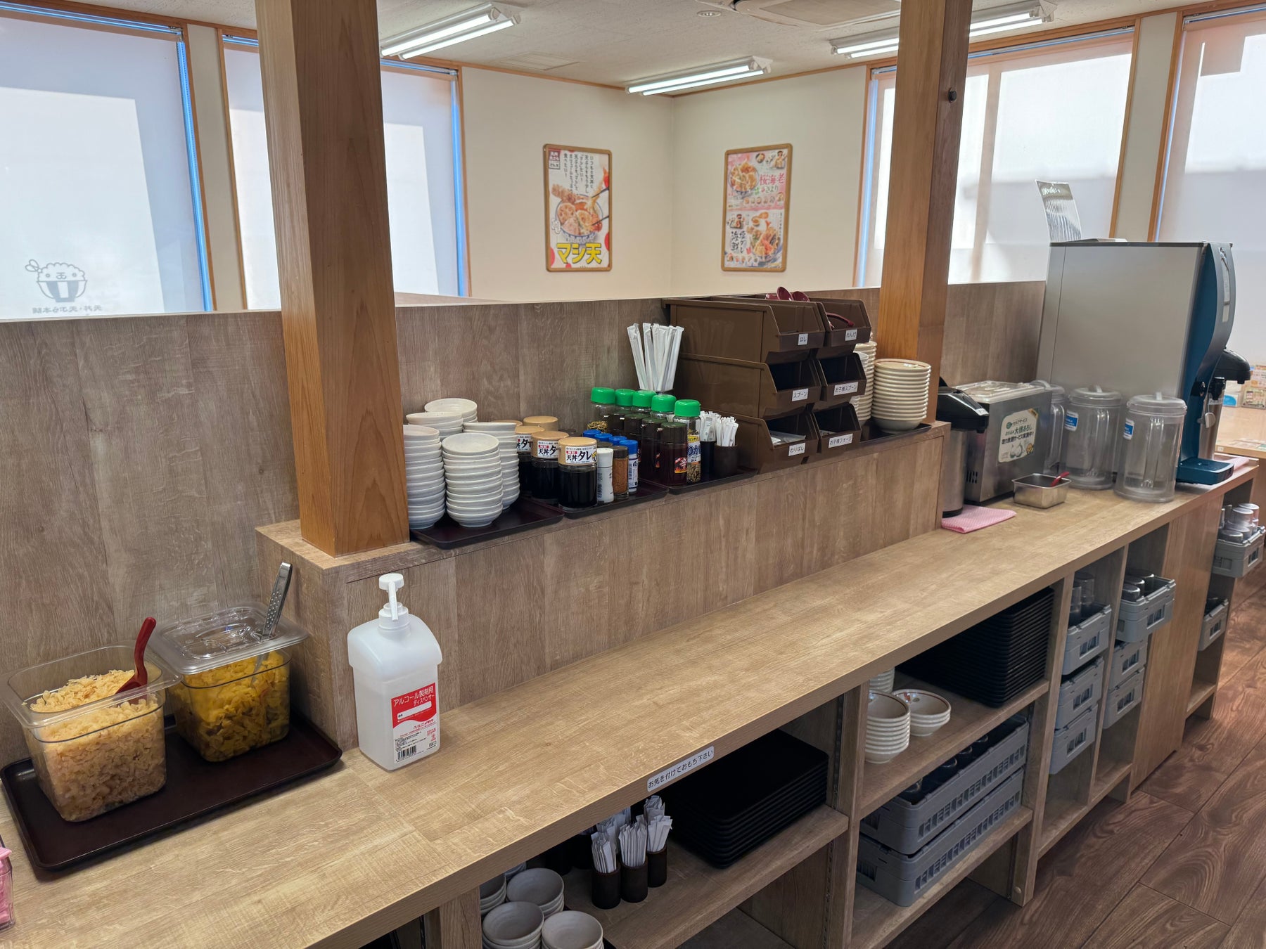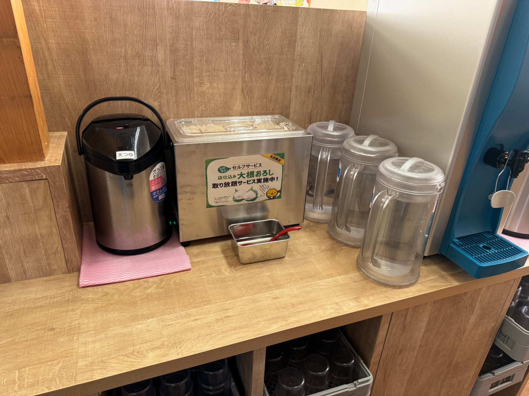 全長3mのセルフバーには、<天かす取り放題・大根おろし取り放題サービス>など、お客様のお好みに合わせてカスタマイズしていただける品揃えをご用意しています。