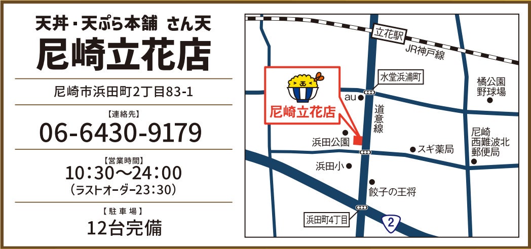 この度リニューアルオープンいたします、尼崎立花店は最寄り駅のJR 立花駅より徒歩約10分の所にあります。揚げたての天丼・天ぷらをお求めやすい価格で店内でもテイクアウトでもお気軽にご利用できます。海老、粉、油、タレにこだわった専門店の揚げたての天丼・天ぷらをぜひご賞味ください。
