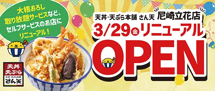 サトフードサービス株式会社(本社・大阪府大阪市、代表取締役社長・杉本 貴之)が運営する「天丼・天ぷら本舗 さん天 尼崎立花店」が3月29日(金)にセルフ型店舗にリニューアルオープンします。大根おろしや天かす取り放題など、セルフ式店舗限定のサービスがあります。揚げたての天丼を450円からというお求めやすいお値段と、店内でもテイクアウトでも、本格的な天丼・天ぷらをお気軽にお楽しみください。