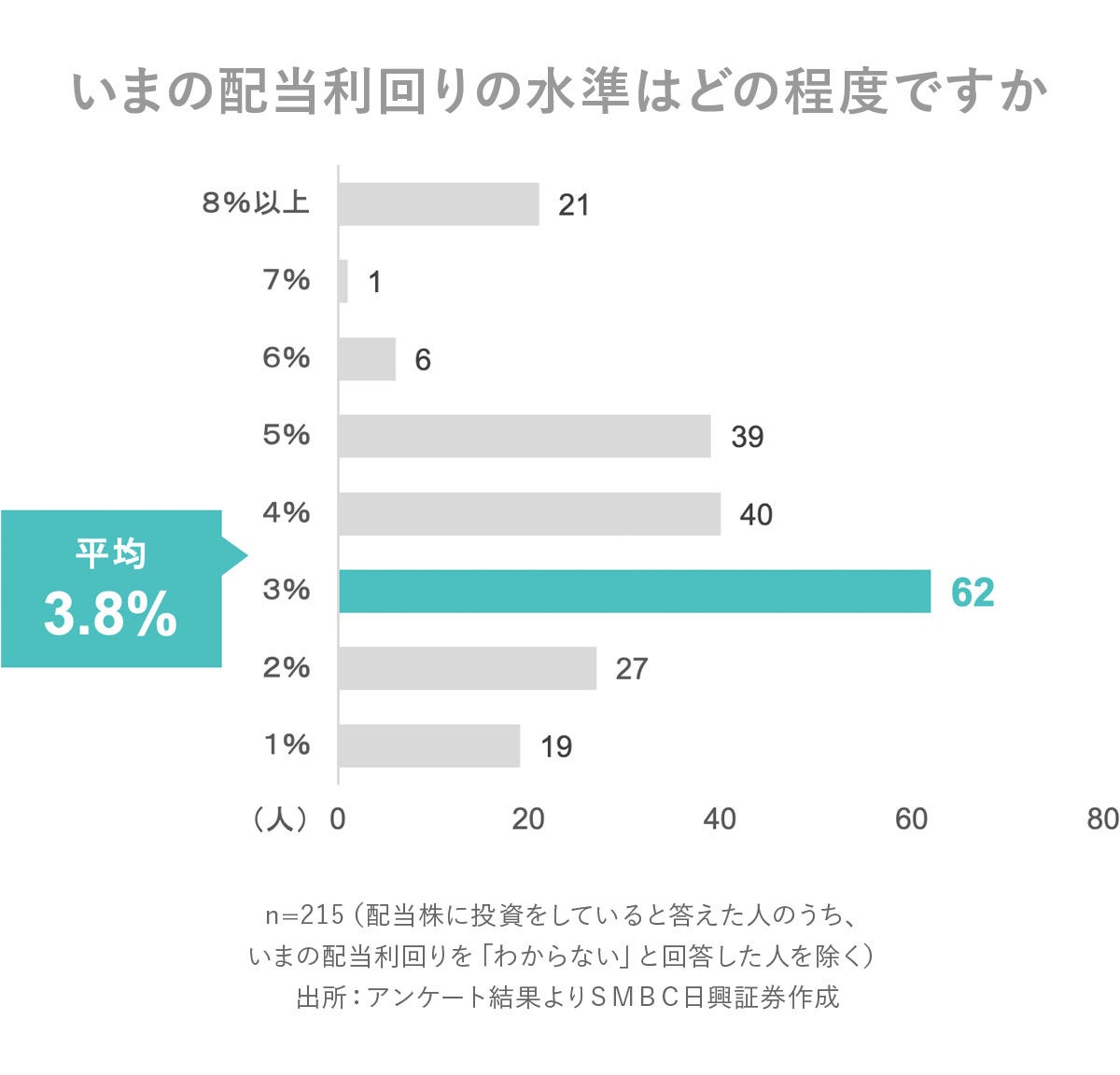 現時点の配当利回りを聞いたところ、「3%」と回答した方が最も多く、平均すると約3.8%に