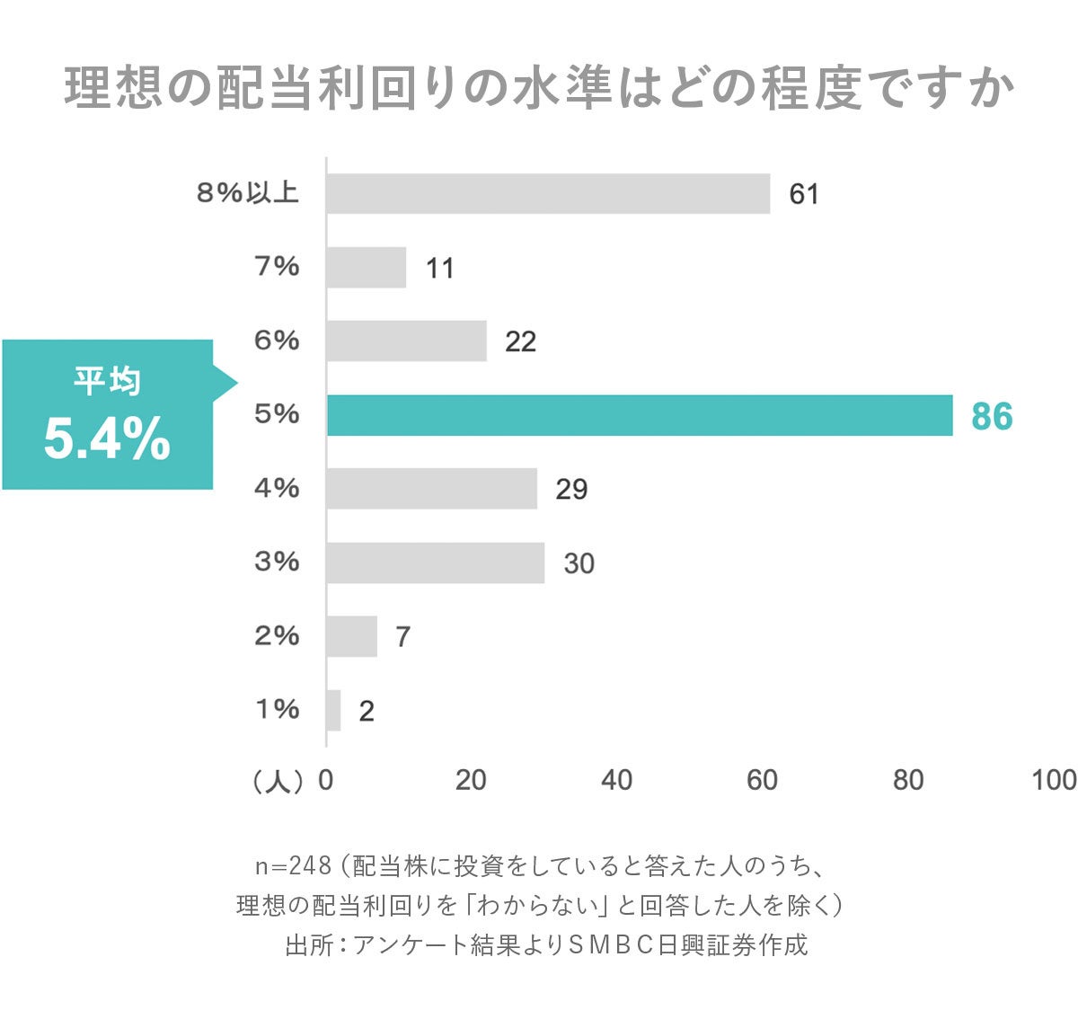 理想の配当利回りを聞いたところ、「5%」と回答した方が最も多く、平均すると約5.4%に