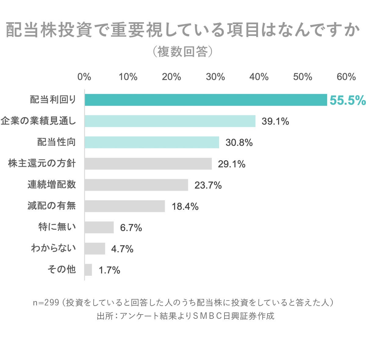 配当株を選ぶときに重要視している項目について聞いたところ、「配当利回り」はもちろん、「企業の業績見通し」「配当性向」などを重視するという人も