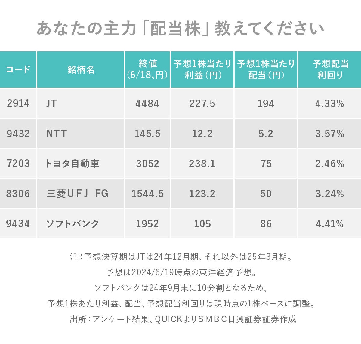 主力となっている配当株を聞いたところ、JT、NTT、トヨタ自動車、三菱UFJ FG、ソフトバンクを挙げる人が多数