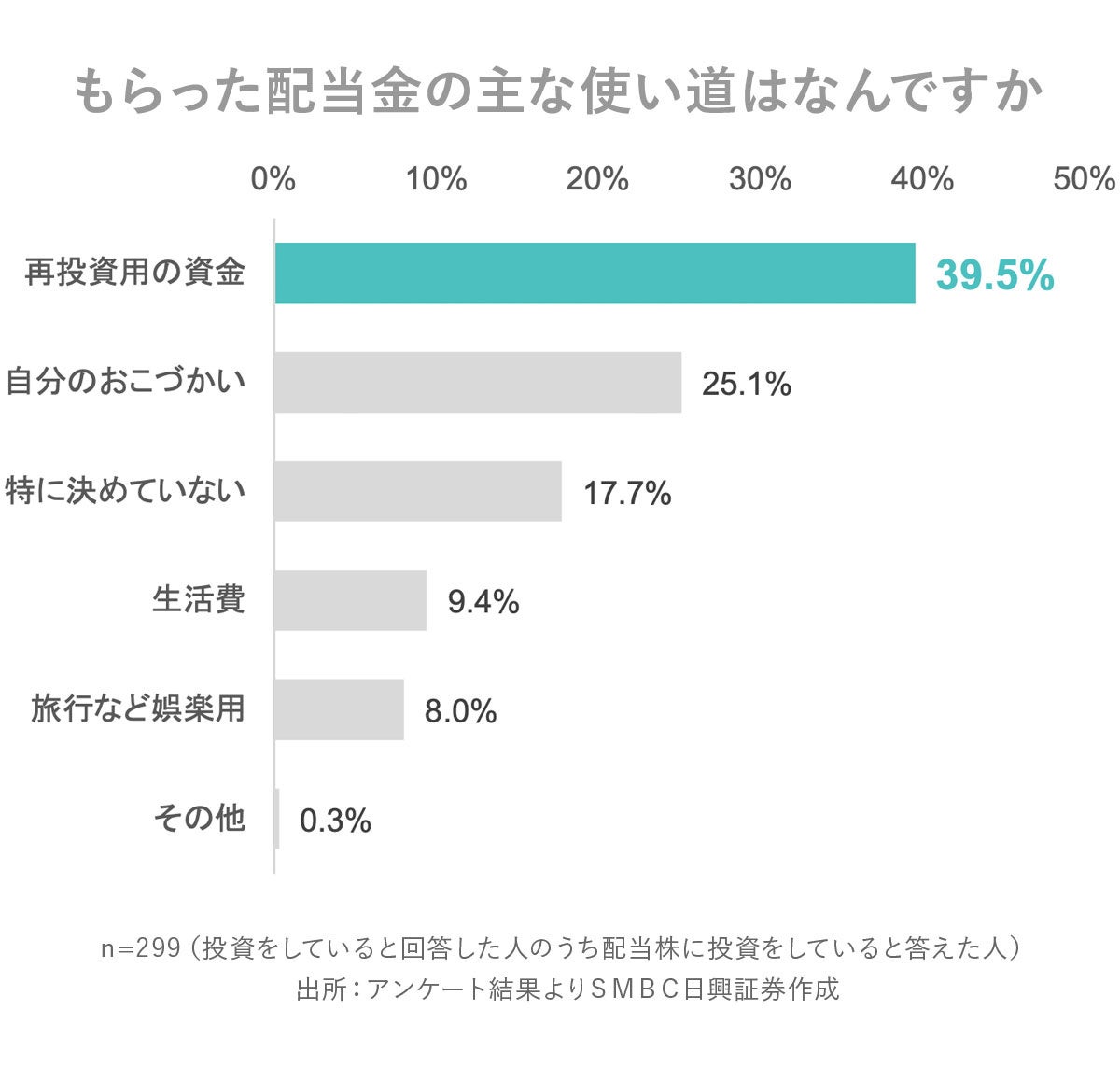 もらった配当金の使い道を聞いたところ、一番多かったのは「再投資用の資金」。次いで「自分のおこづかい」「特に決めていない」