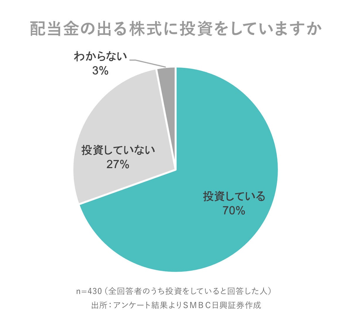 インターネットアンケート回答者(954名)のうち、投資や資産運用をしている430名に、「配当金の出る株式に投資をしていますか」と聞いたところ、7割の方が「配当株」に投資をしていると回答
