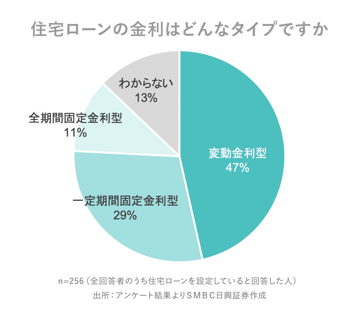 住宅ローンを設定している人に、金利タイプを聞いたところ、「変動金利型」と答えた人が約半数