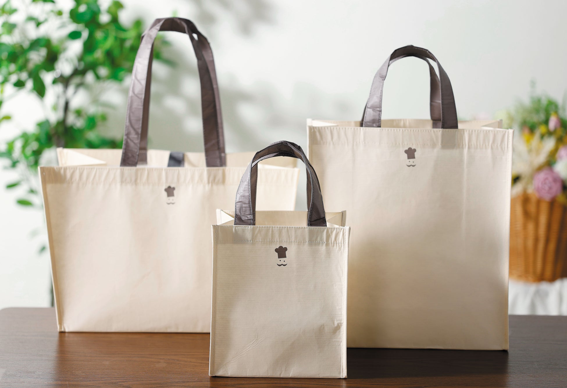 どのサイズもマチが広いので、お肉や魚などのトレーのものや幅のある商品も横にならず、入れることができます。材質はポリエステル素材なので、ちょっとした雨にも対応できます。色は「ナチュラル」「自然」をイメージし、上品で落ち着きのある、普段の生活になじみやすい色のベージュを基調としています。さりげなくワンポイントでクイーンズ伊勢丹のシンボルマークである、シェフマークを入れました。