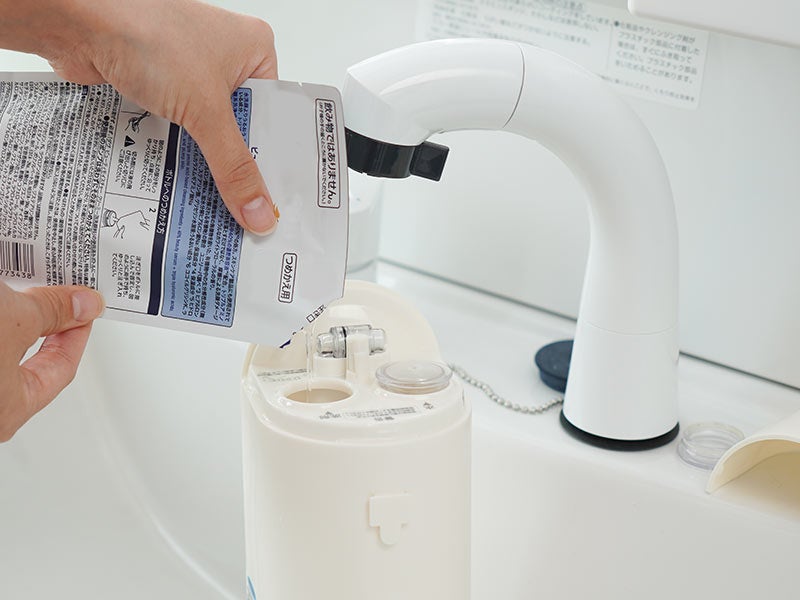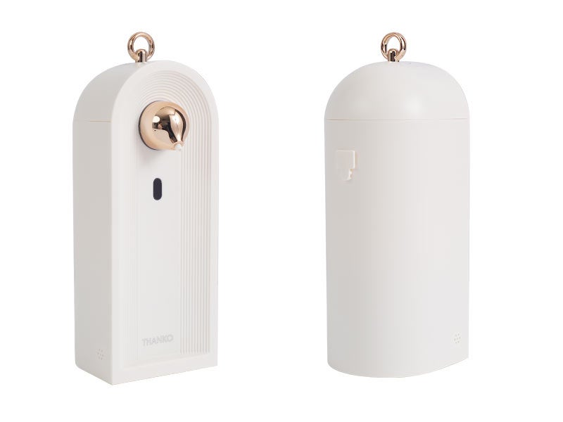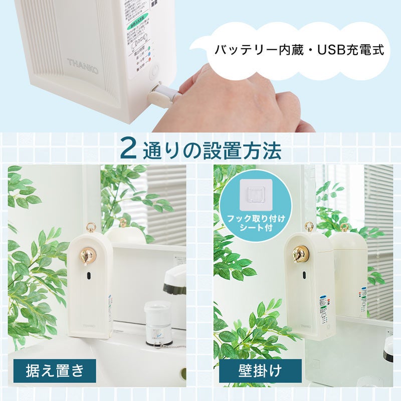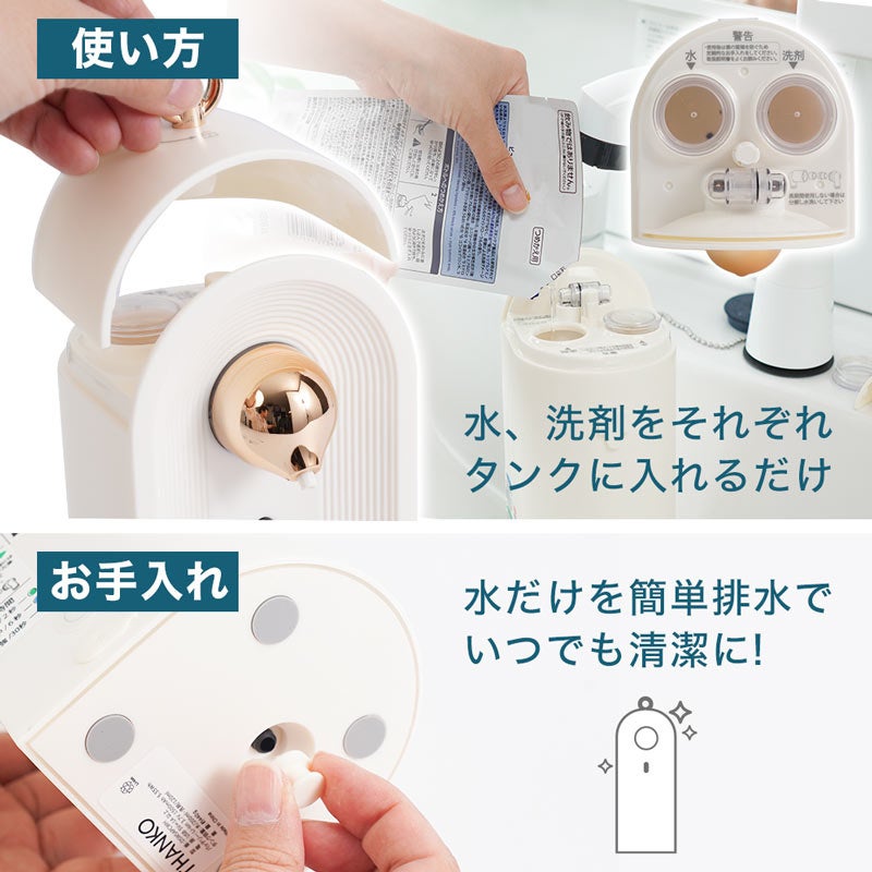 幅91×奥行105×高さ245mm。USB充電式。水を入れるタンク(200ml)とお手持ちの洗顔料などを入れるタンク(120ml)の2つのタンクからなり、本体の前に手をかざすと自動で水と洗顔料を混ぜ合わせてクリーミーな泡を作り出します。