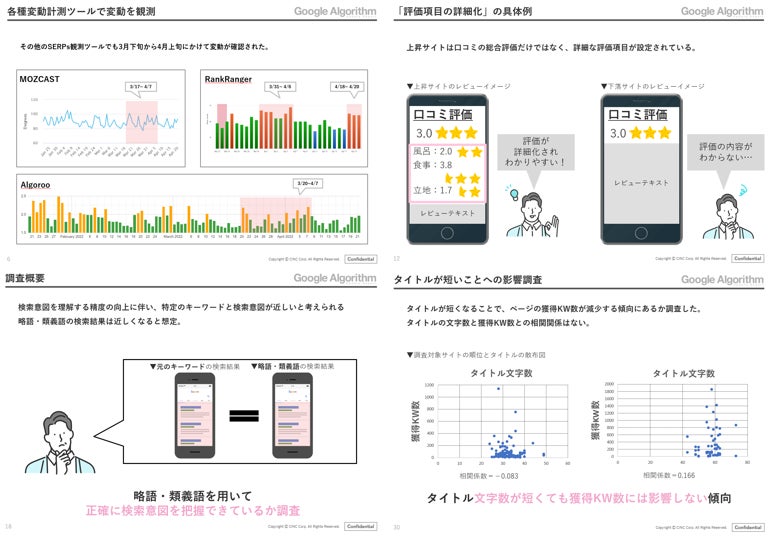 今回のGoogleアルゴリズムアップデートレポートでは、4月のSERPs変動傾向や、詳細な評価項目があるサイトの上昇の確認、タイトルが短いページの順位が高い傾向にあることなどについて、調査・分析をし、最新のGoogleのリリース情報も掲載しています。
