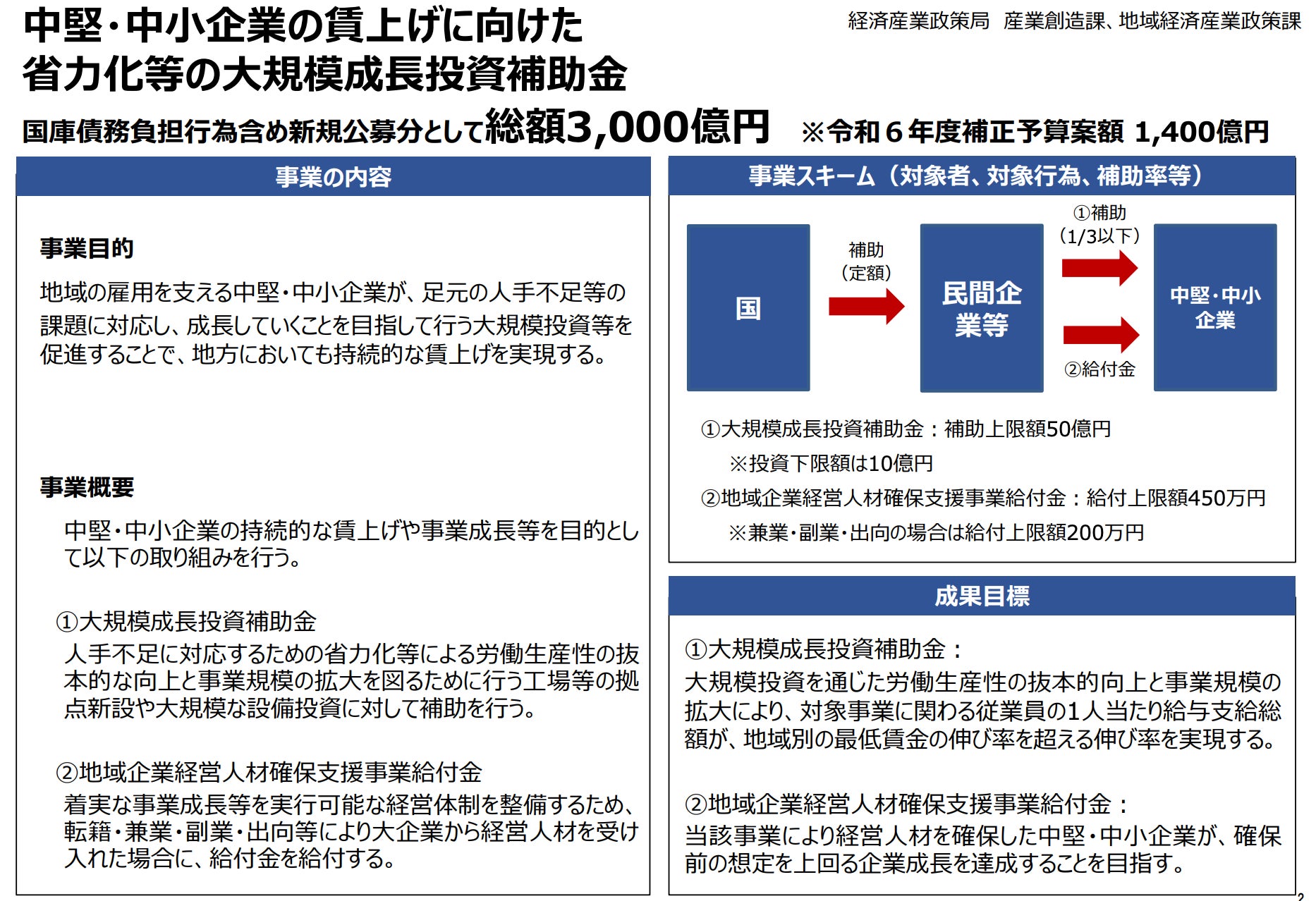 中小企業成長加速化補助金とは、新たに令和6年度補正予算において創設される、総予算1000億円の中小企業向けの補助制度です。売上高100億円を超える中小企業を安定的に増やすために、売上高100億円を目指す中小企業に対して、設備投資の支援をおこないます。