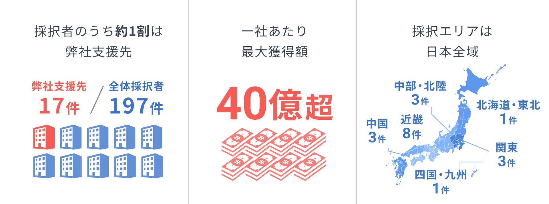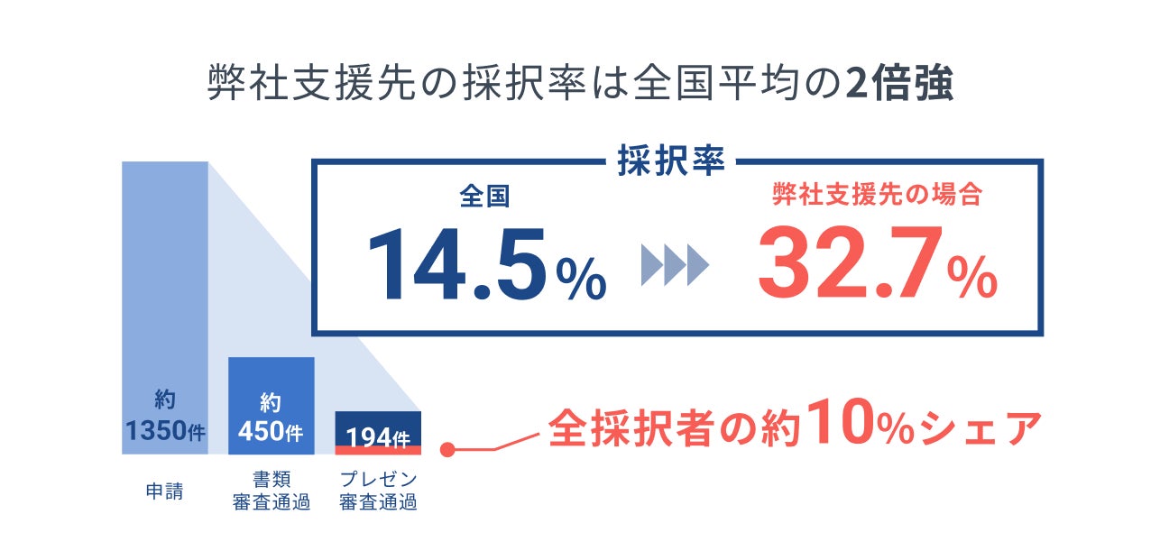 当社は、令和4年度補正予算における大規模成長投資補助金の書類審査及びプレゼン審査で17件を最終採択に導きました。これにより、当社の採択率は全体平均の2.3倍となる32.7%(全体平均14.5%)に達し、高水準を記録しました。