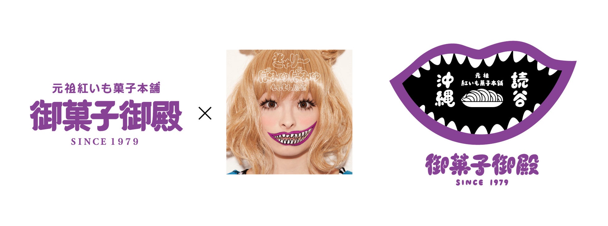 沖縄では、元祖紅いもタルトが大人気の「御菓子御殿」とのコラボレーションが決定。首里城のようなお店に踏み入ると、そこは沖縄の素材にこだわった商品が並ぶ”沖縄を体感”できるお土産施設。そんな「御菓子御殿」とのコラボレーションは、まさに全てはここから始まった、きゃりーぱみゅぱみゅの衝撃のデビューミニアルバム「もしもし原宿」(2011年)のジャケットをオマージュしたコラボロゴに大変身。