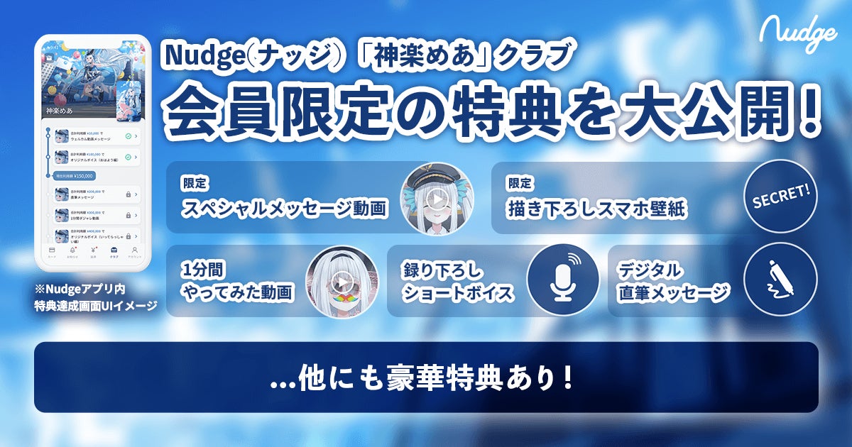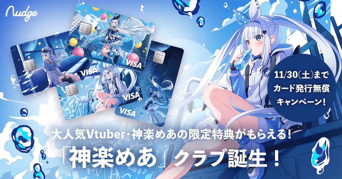 ナッジ株式会社(本社:東京都千代田区、代表取締役:沖田 貴史、以下「ナッジ」)は、次世代クレジットカード「Nudge(ナッジ、以下「ナッジカード」)」において、2024年10月25日に人気VTuber「神楽めあ」との提携を開始し、日常の買い物を通じて神楽めあを応援できる限定特典付きクレジットカードを提供開始いたしました。