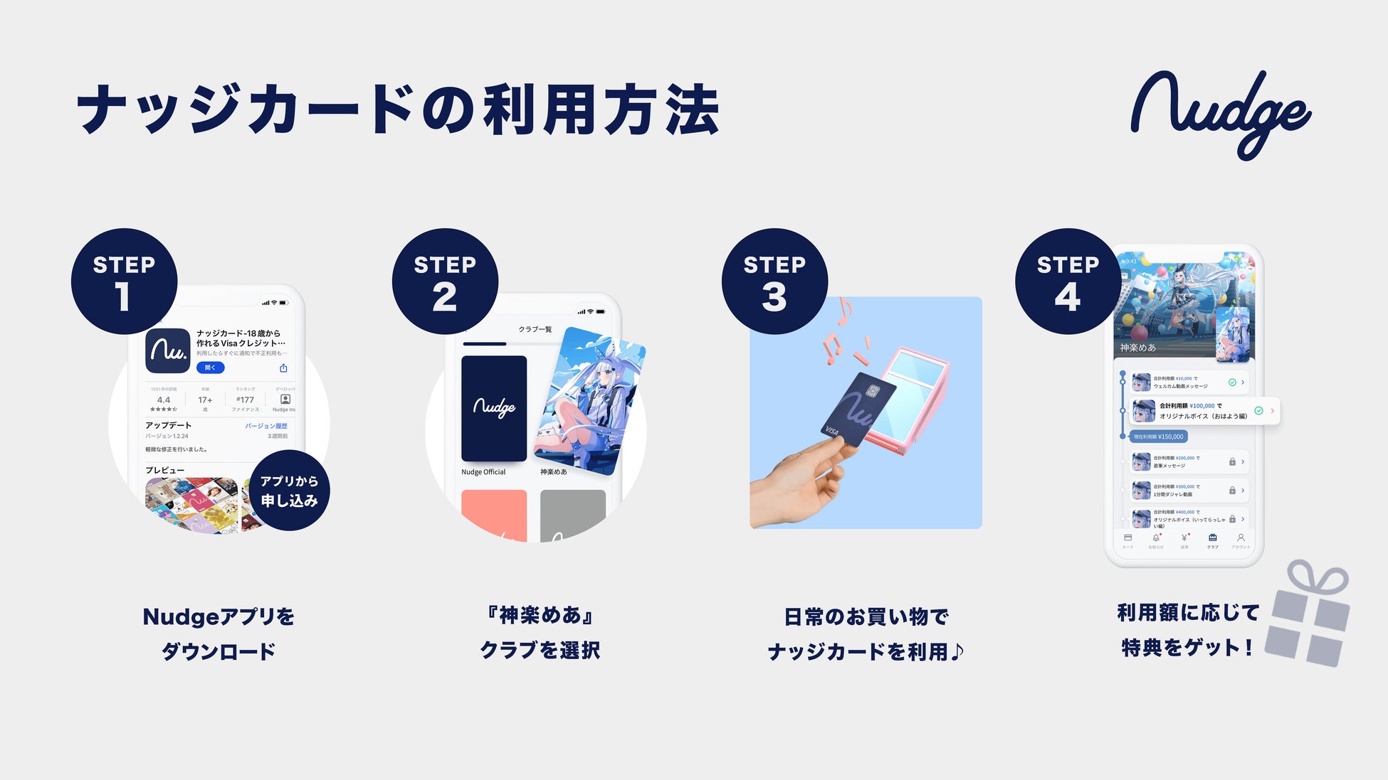 1. Nudgeアプリをダウンロードしアプリ内で入会申込 2. クラブ選択画面にて「神楽めあ」を選択 3. カードを使ってお買い物をして特典をゲット! |