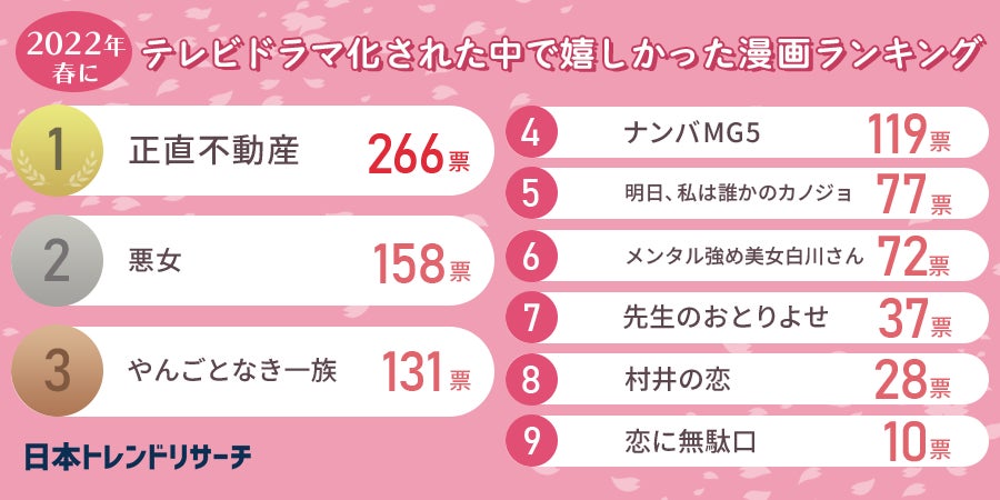 質問1:2022年春にテレビドラマ化された漫画の中で、あなたがもっともドラマ化されて嬉しかった漫画を一つ選んでください。