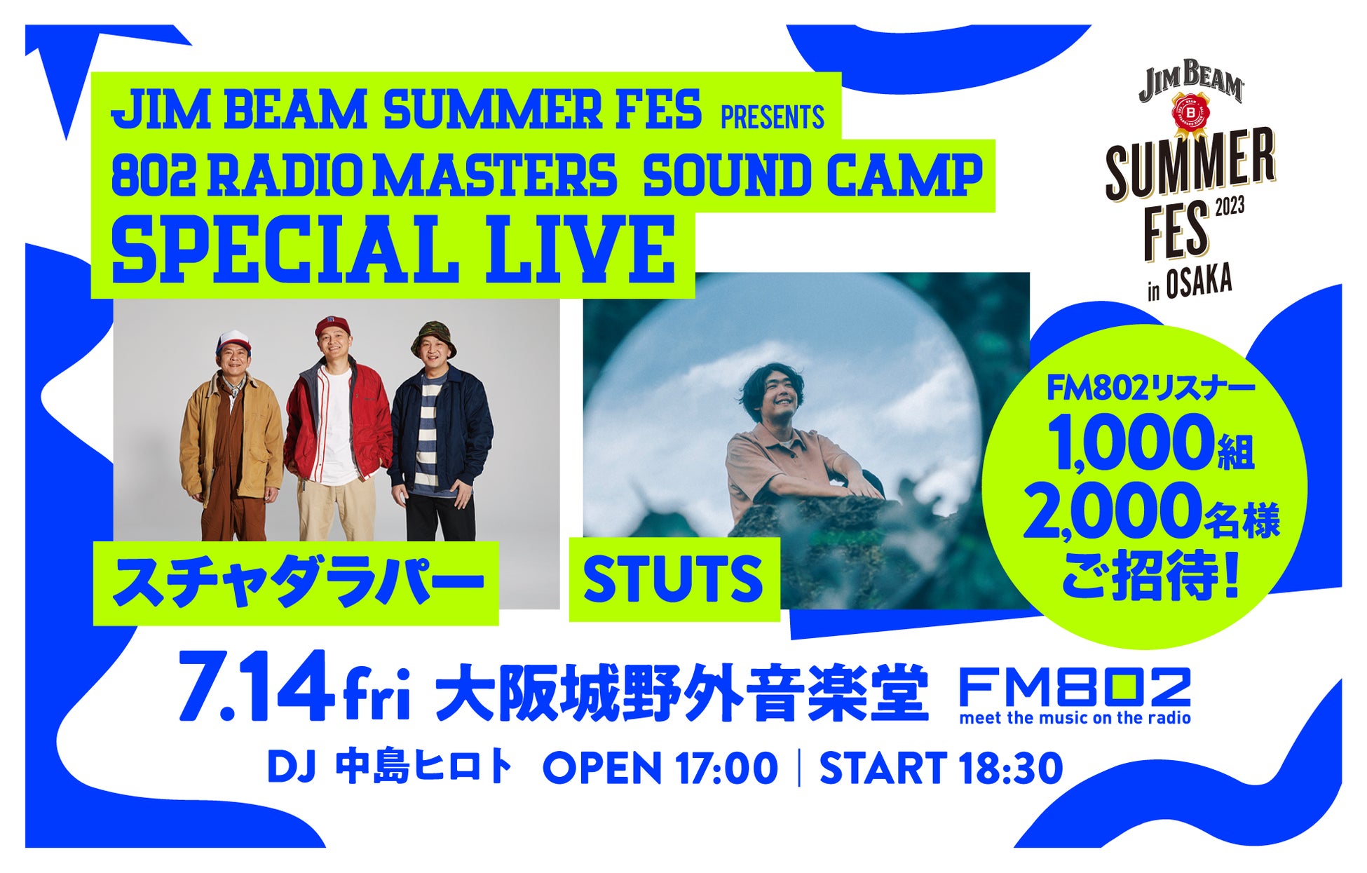 世界No.1(※)バーボンウイスキー「JIM BEAM」と大阪のラジオ局FM802「802 RADIO MASTERS」がタッグを組んで、この夏、リスナー無料招待イベントを開催!会場は大阪城野外音楽堂。出演はスチャダラパー、STUTS!このイベントにFM802リスナー1,000組2,000名をご招待します!