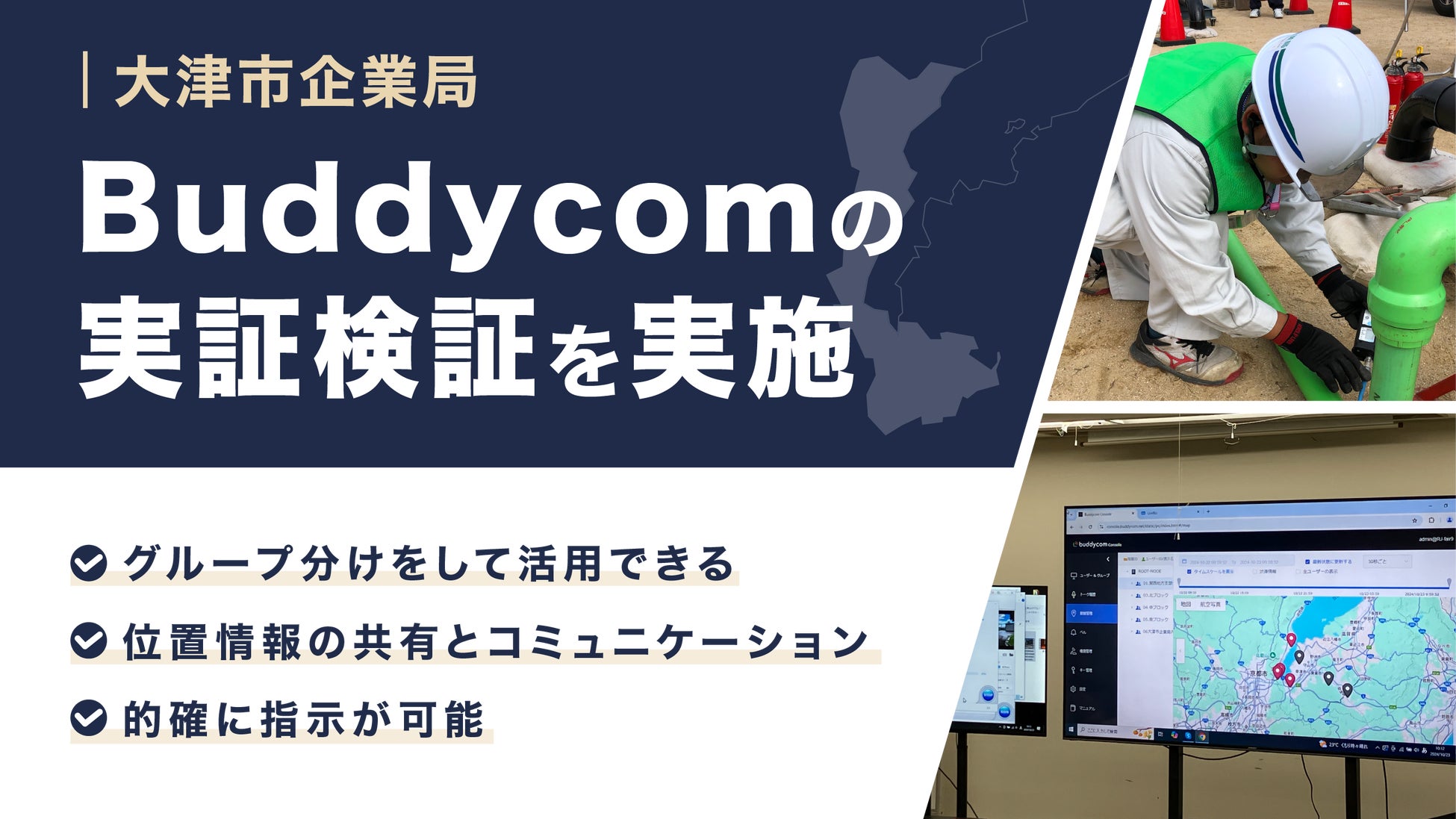 大津市企業局では総合防災訓練、及び応急給水訓練にて、Buddycomの実証検証を実施いたしました。従来は簡易無線機や電話等を使用しておりましたが、無線機の電波が届かないエリアがあったほか、誰がどこにいるかを把握することを口頭で伝達しなければならないと言った課題がありました。