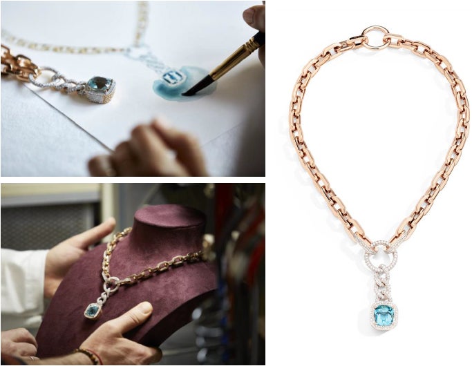 ローズゴールドにアクアマリンとホワイトダイヤモンドをあしらった「Princess The Rapper Acqua」は、ゴールドの長方形リンクの幾何学的なフォルムと、ホワイトゴールドにまばゆいダイヤモンドを敷き詰めたグルメリンクを組み合わせ、さらに中央の光り輝く15カラット以上のシーブルーアクアマリンによって、日の光の力を表しています。