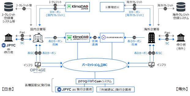 KlimaDAO JAPANが開設予定のブロックチェーンを活用したDカーボンマーケットプレイス「KlimaDAO JAPAN MARKET」と「Progmat Coin」基盤が連携し、オプテージが企業向けインフラを提供することで、本邦初となる高い透明性・信頼性・効率性を担保したカーボンクレジットの企業間売買が実現可能となります。さらに、KlimaDAOが既にグローバルで展開しているマーケットプレイス「Carbonmark」と連携し、決済に各種国産SCを用いることで、クロスボーダーで世界規模の流動性創出を目指します。
