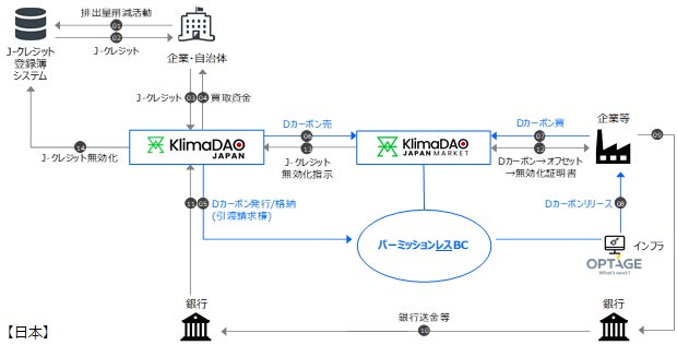 Dカーボンは、KlimaDAO JAPANが企業・自治体から買い取ったJ-クレジット等に対する引渡請求権を、グローバルにアクセス可能なパーミッションレスブロックチェーン上のトークンとして発行するものです。当該ブロックチェーンにアクセスしDカーボンを管理するために必要な企業向けインフラをオプテージが提供し、銀行送金等での資金決済とすることで、まずは企業が取引参加しやすい環境で市場開設する想定です。