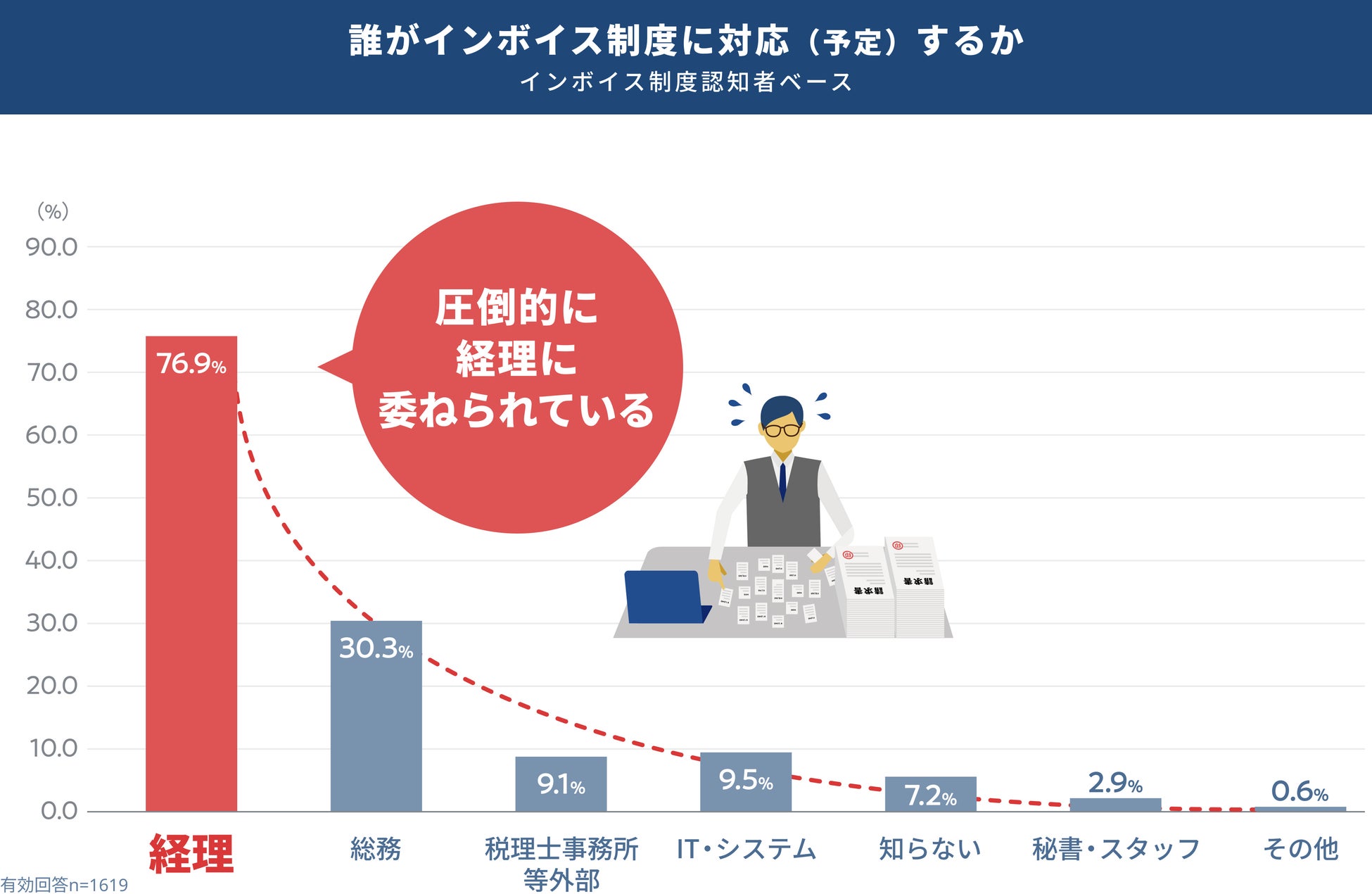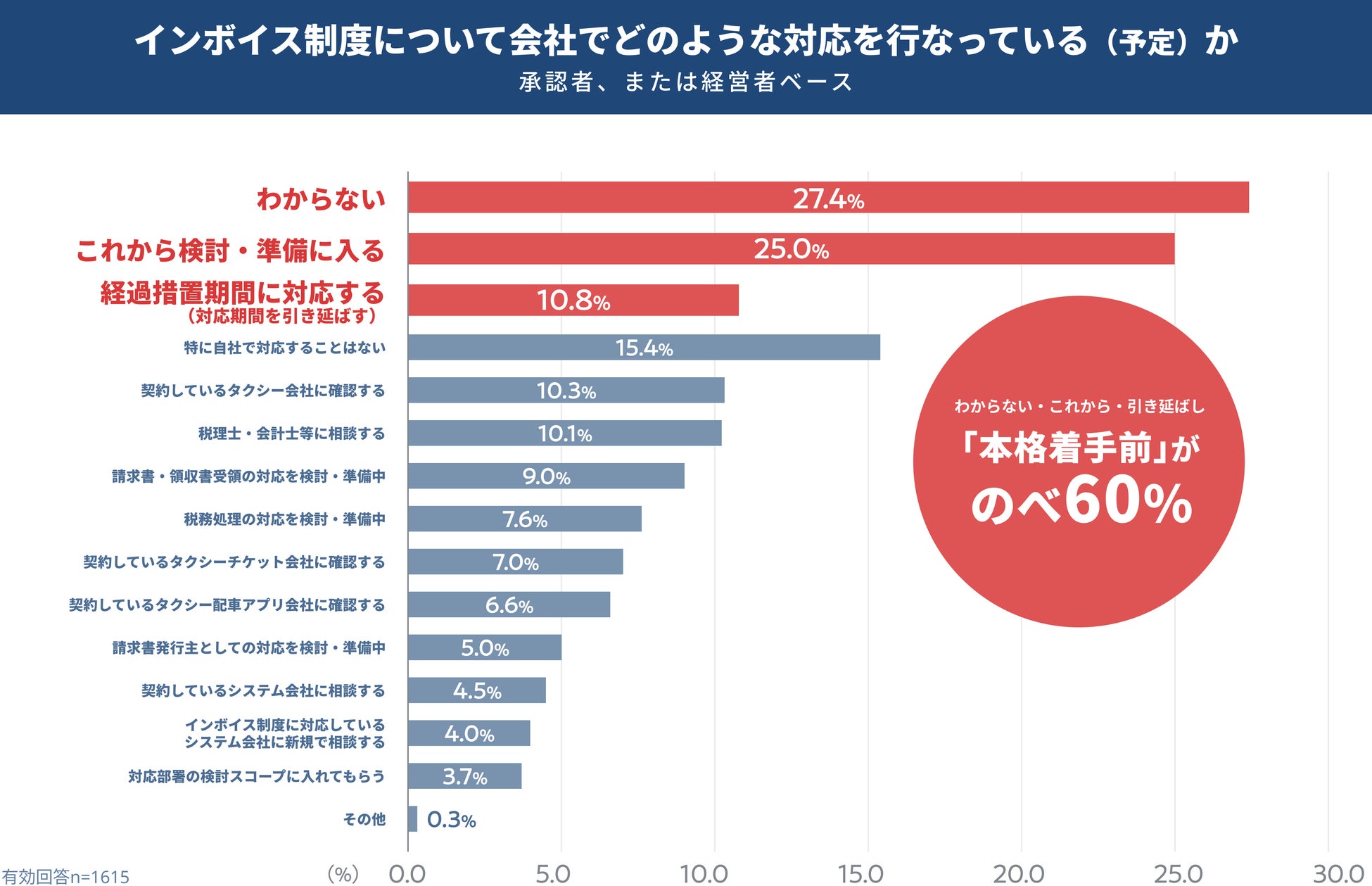 インボイス制度対応は経理に委ねられるが、経理の4割がタクシー領収書を対象と認識していないことから、施行後に後から対応するケースも予測される。