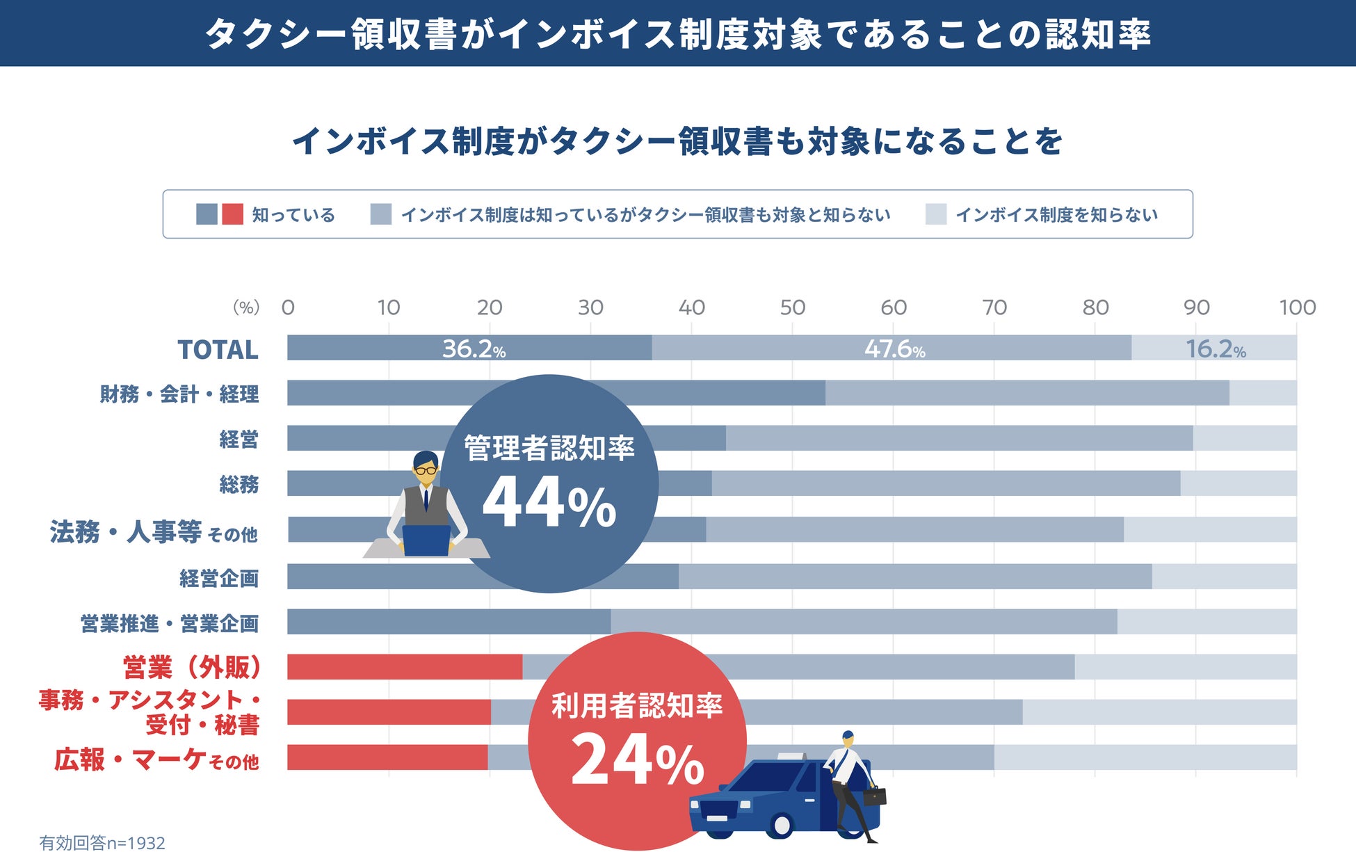 |調査結果1 インボイス制度でタクシー領収書も対象になると知っているのは全体で36%。実際にタクシー利用する層と承認層との差が顕著な結果に。