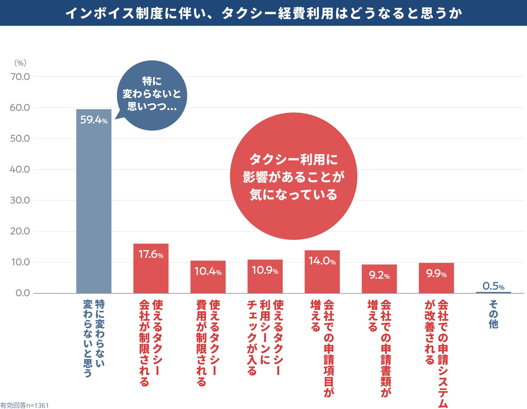 |調査結果2 インボイス制度下で起こる影響は、特に変わらないのではないかと捉えつつ、「使えるタクシー会社が制限される」「申請項目が増える」ことへの警戒感も。