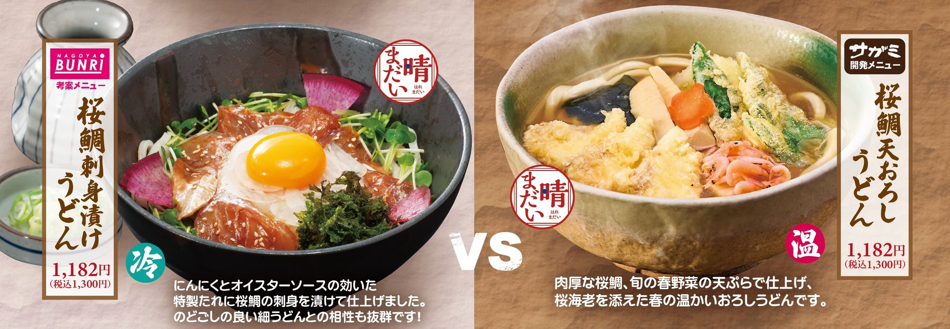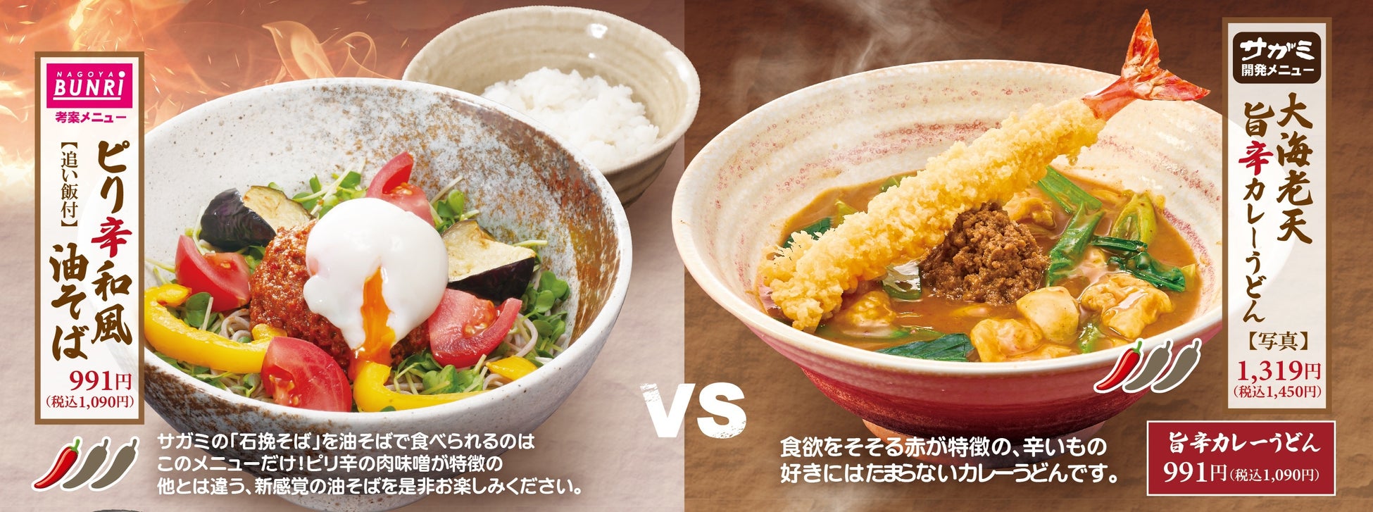 また初の試みとしてメニューは対決形式になっており、名古屋文理大学と和食麺処サガミのそれぞれの商品の魅力が光るようにいたしました。サガミ稲沢店の限定メニューとなりますので、この機会に是非ご賞味ください。