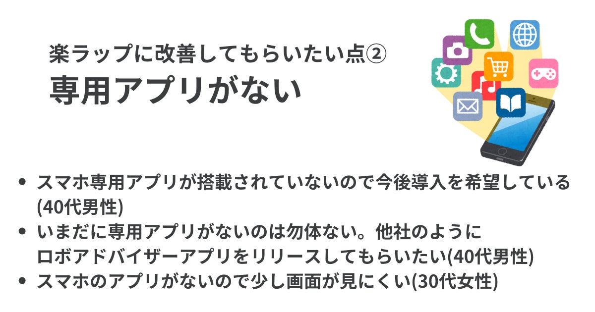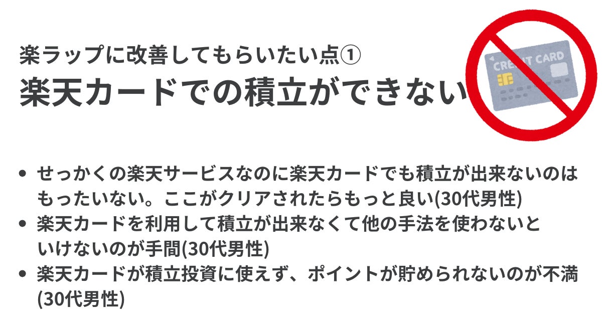 一方、改善点としては「楽天カードでの積立ができない」という意見が特に多かった。