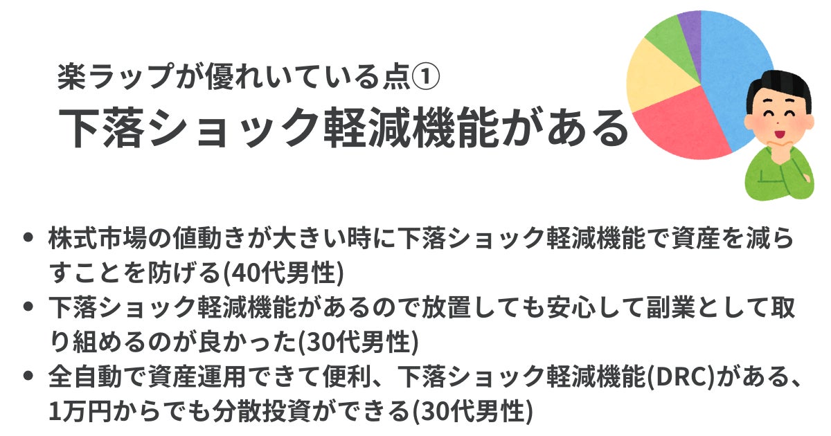 また、「下落ショック軽減機能がある」点を評価する声もあった。これは、株式市場の相場変動時に自動で株式の投資比率を下げ、反対に債券の投資比率を上げることで資産全体のマイナスを限定する楽ラップ独自の機能であり、多くの投資家から支持されていた。