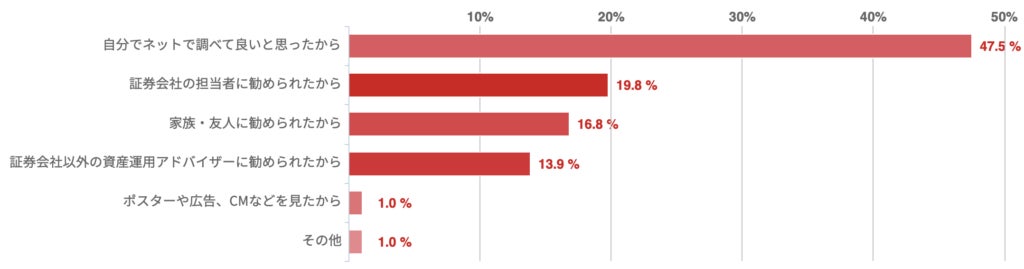 また、その他には「証券会社の担当者に勧められたから(19.8%)」「家族・友人に勧められたから(16.8%)」「証券会社以外の資産運用アドバイザーに勧められたから(13.9%)」などの理由が並んだ。