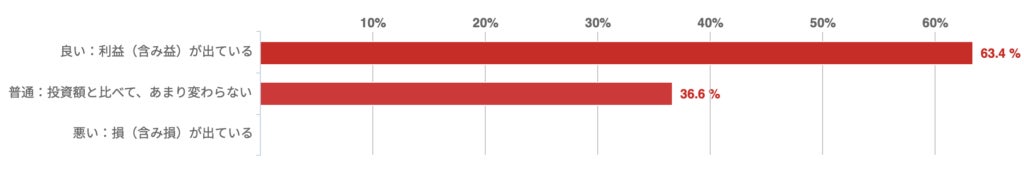 アンケートによれば、63.4%の投資家が「利益(含み益)が出ている」と回答したが、「投資額と比べてあまり変わらない」と答えた投資家も36.6%いた。