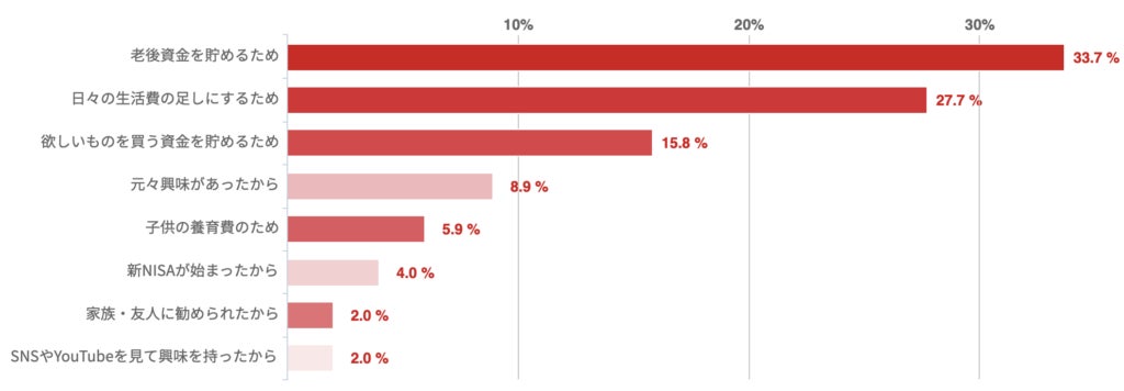 アンケートによれば、回答者が投資を始めたきっかけとしては「老後資金を貯めるため(33.7%)」と「日々の生活費の足しにするため(27.7%)」が多かった。