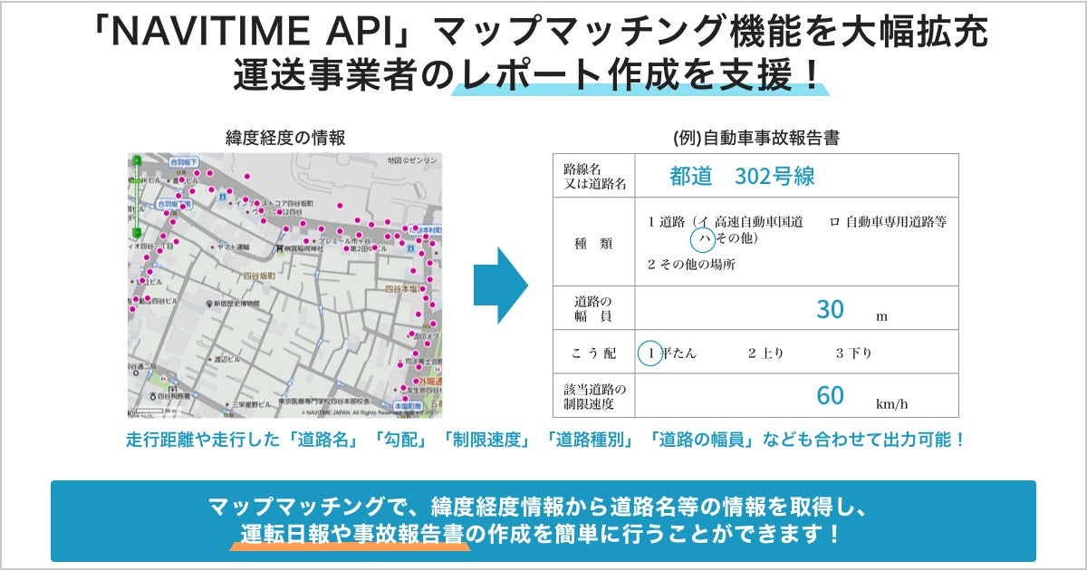 株式会社ナビタイムジャパン(代表取締役社長:大西啓介、本社:東京都港区)は、2022年8月31日(水)より、法人向け地図・ルート検索API『NAVITIME API』にて、運送事業向けに、マップマッチング機能を大幅に拡充いたします。
