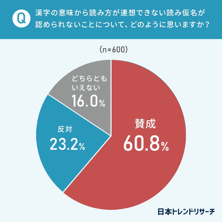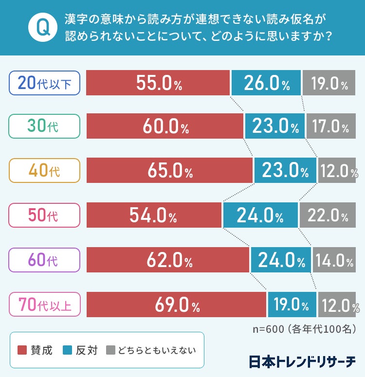 漢字の意味から読み方が連想できない読み仮名が認められないことについては、全ての年代で「賛成」が最も多くなりました。
