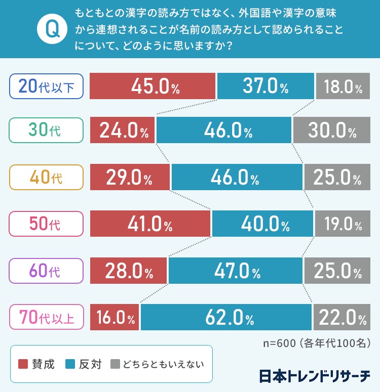 一方で、「一郎(たろう)」「高(ひくし)」など、明らかに漢字本来の読み方や 意味と異なる読み仮名が認められないことについては、全ての年代で認められないことに「賛成」という方が多数派となりました。