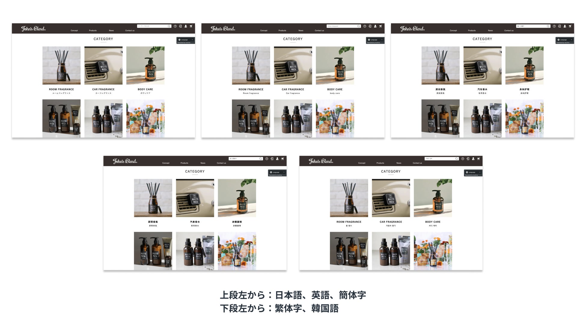 「John’s Blend」は、「いい香りを身近に感じることで、日々の生活が豊かになってほしい」という想いから生まれたフレグランスブランドです。人気の「ホワイトムスク」の香りを始め、フレグランス・ボディケア用品を豊富に取り扱っており、国内での人気も高まっております。こうした魅力ある商品の海外展開をさらに強化するべく、今回ウェブサイトの多言語化に踏み切りました。商品詳細だけでなく、ブランドコンセプト、コラム、ニュースなどの情報発信にも力を入れ、ブランドの魅力を海外のお客様にも届けています。