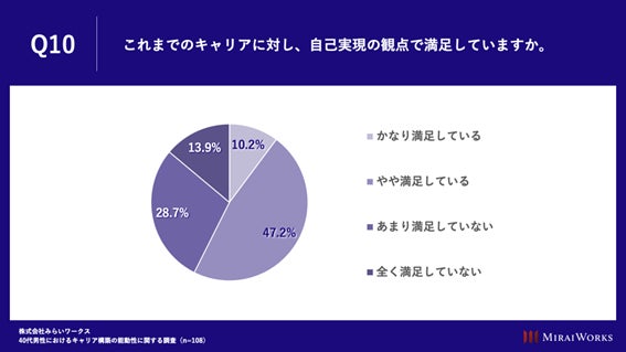 また、「Q1.今まで、あなたは自身のキャリアをどの程度能動的に構築してきたと思いますか。」という問いで「かなり能動的」または「やや能動的」と回答した方(n=49)の67.3%が、「Q10.これまでのキャリアに対し、自己実現の観点で満足していますか。」という問いに対し「かなり満足している」または「やや満足している」と回答しました。