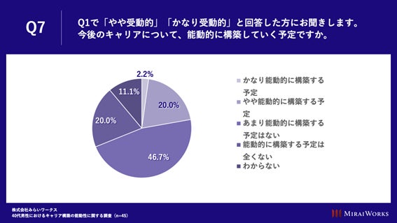 Q1で「やや受動的」「かなり受動的」と回答した方に、「Q7.今後のキャリアについて、能動的に構築していく予定ですか。」(n=45)と質問したところ、「あまり能動的に構築する予定はない」が46.7%、「能動的に構築する予定は全くない」が20.0%という回答となりました。