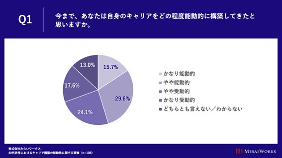 プロフェッショナル人材のフリーランス・副業といった多様な働き方をサポートする株式会社みらいワークス(本社:東京都港区、代表取締役社長:岡本祥治、証券コード:6563、以下「当社」)は、企業の総合職として勤める40代108名に対し、40代男性におけるキャリア構築の能動性に関する調査を実施いたしましたので、お知らせいたします。