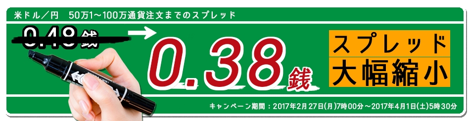 このたび、より多くのお客さまに当社のFX取引をご体感いただけるよう、2/27より『SBI FXTRADE』の米ドル/円50万1通貨から100万通貨注文までの基準スプレッドをキャンペーン期間において従来より約20%縮小となる0.38銭にてご提供致します。