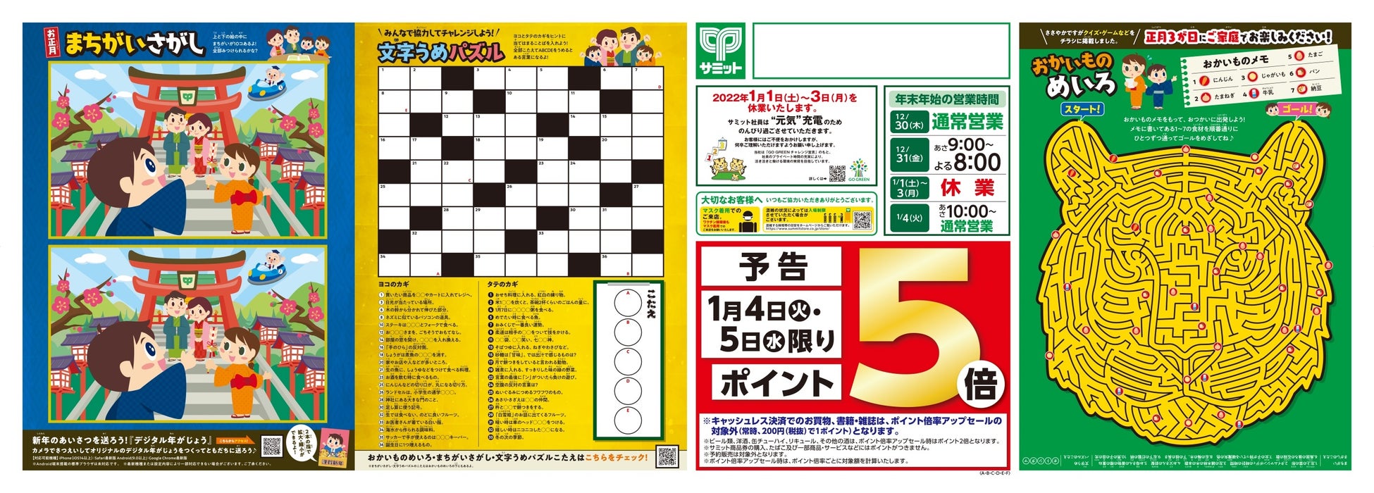 サミットでは12月30日に下記の新聞折り込みを実施します。このチラシには、ご家庭で楽しめる「まちがいさがし」や「めいろ」「すごろく」などのゲームを掲載しています。チラシの両面に展開された4種類のクイズやゲーム、オリジナルの年賀状がつくれる「デジタル年がじょう」作成で、年末年始のおうち時間を楽しく過ごせるお手伝いをいたします。