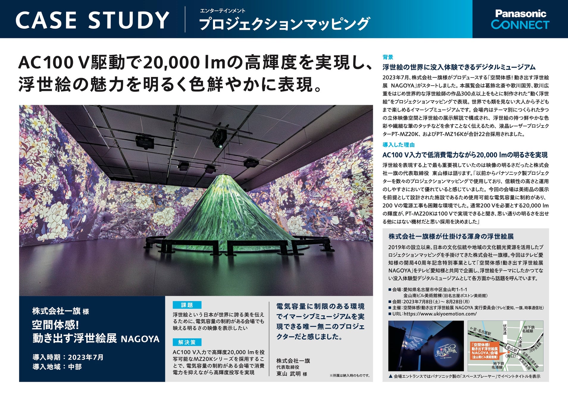 株式会社一旗(代表取締役:東山武明)がプロデュースする「空間体感!動き出す浮世絵展 NAGOYA」(2023年7月8日(土)〜8月28日(月)、金山南ビル美術館棟(旧名古屋ボストン美術館)で開催 主催:空間体感!動き出す浮世絵展 NAGOYA 実行委員会(テレビ愛知、一旗、時事通信社))の事例が、Panasonic Connect 業務用プロジェクター総合カタログの表紙に採用されました。電気容量の制約がある会場で消費電力を抑えながら浮世絵の持つ鮮やかな色彩や繊細な筆のタッチなどを余すことなく伝えるため、Panasonic Connectの最新型液晶レーザープロジェクターを使用。AC100V駆動で20,000ルーメンの高輝度を実現し、浮世絵の魅力を色鮮やかに表現しました。【Panasonic Connect 業務用プロジェクター総合カタログURL】 https://content.connect.panasonic.com/jp-ja/fai/file/52376