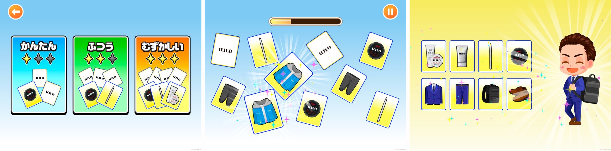 洗顔やスキンケア、スーツなどの“おでかけアイテム”のイラストが描かれている複数のカードを1枚ずつめくり、制限時間内に同じアイテムのペアを見つけて獲得するゲームです。「かんたん」、「ふつう」、「むずかしい」の3つの難易度があります。ゲーム後、獲得したアイテムによってキャラクターのおでかけの装いが変化します。 ※初回プレイ時は「かんたん」のみ選択可能です。