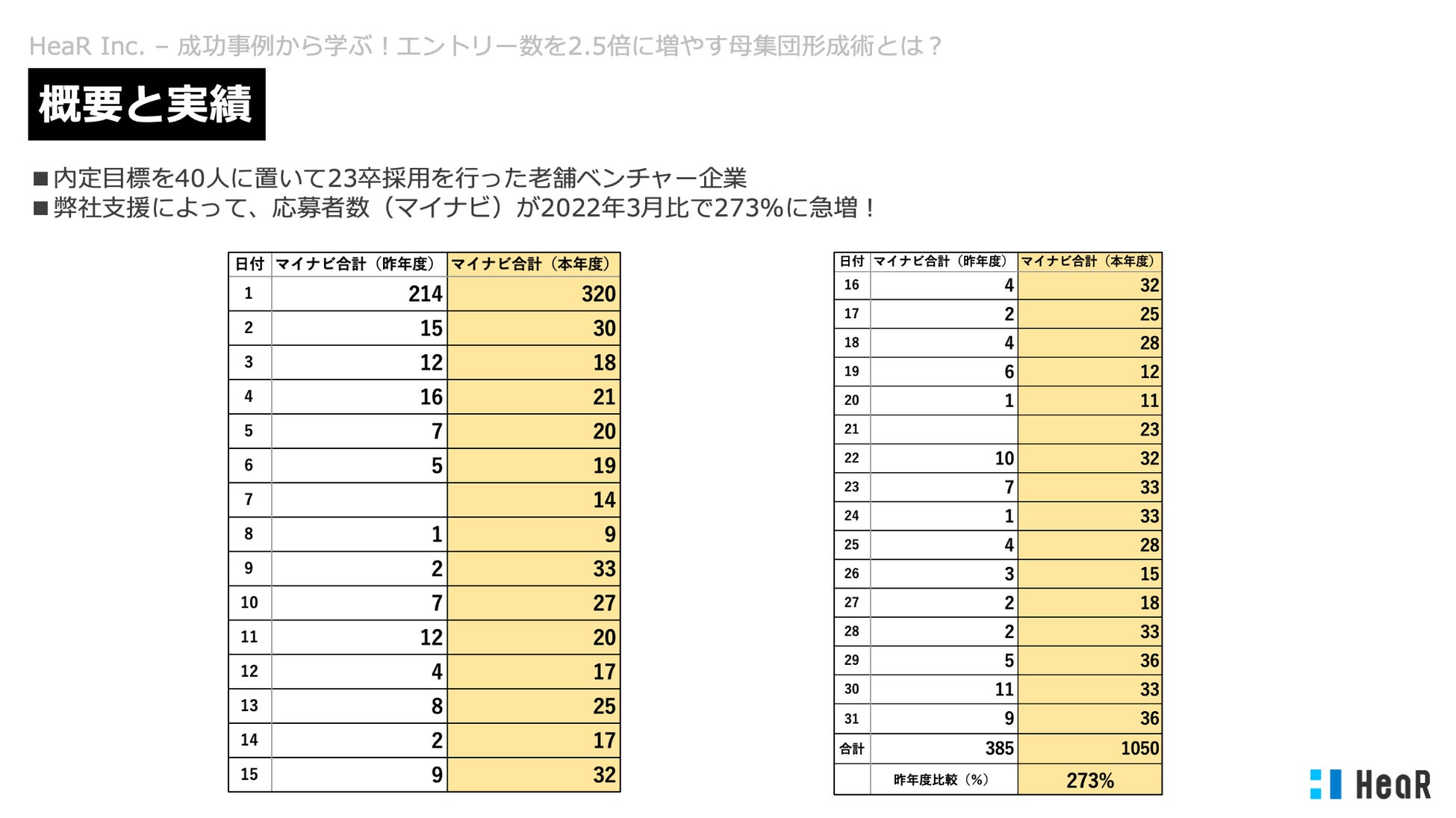 そこでHeaR株式会社が先週実施した「成功事例から学ぶ!エントリー数を2.5倍に増やす母集団形成術とは?」に関する資料を配布します!