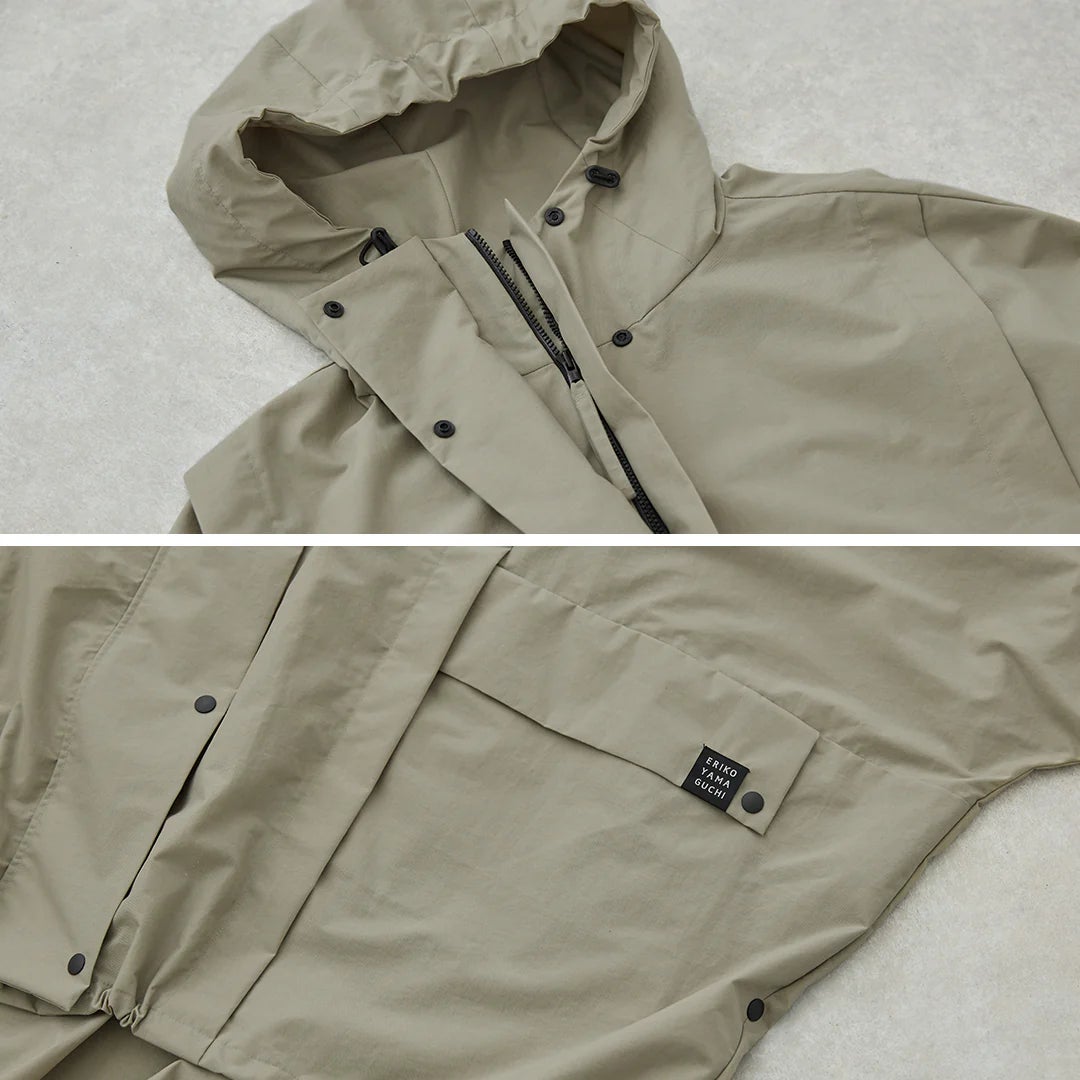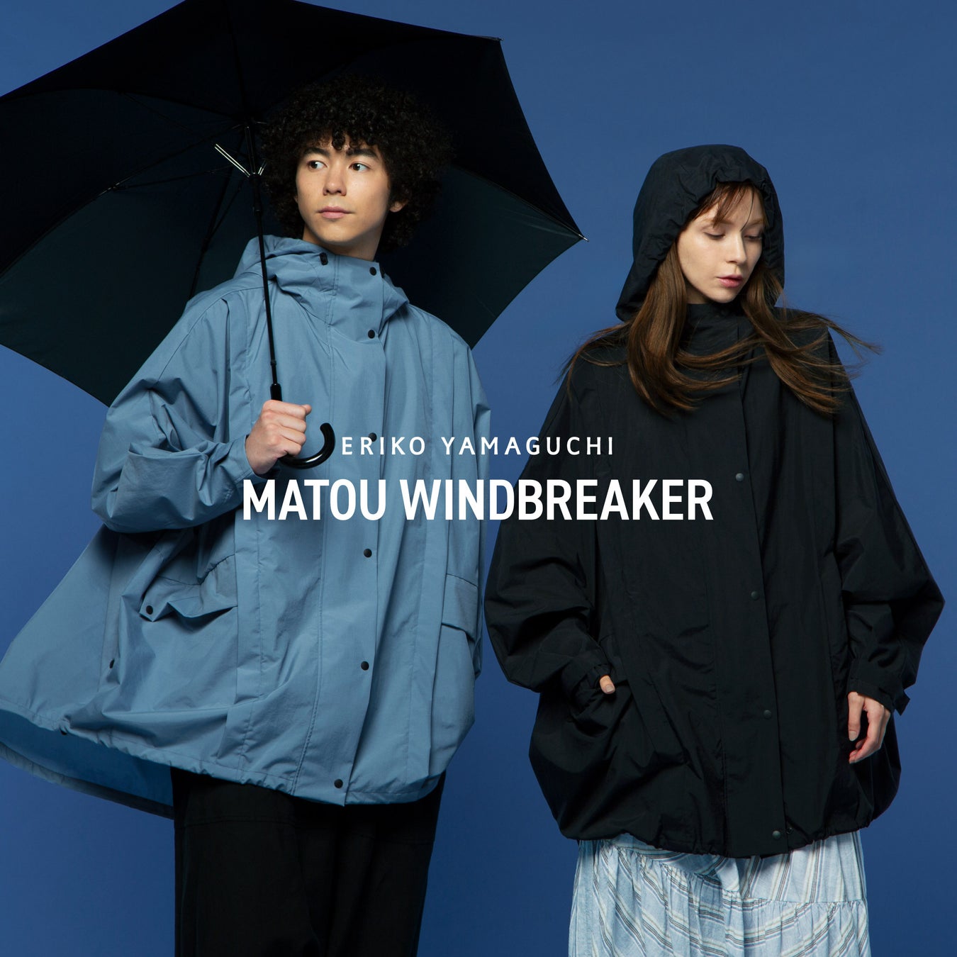 そんな思いから開発が始まった『Matou Windbreaker』は、ERIKO YAMAGUCHI の定番 ”Matou” シリーズのドルマン型を元にした、ブランド初の撥水アウターです。雨の日がむしろ楽しみになるような、大人のウィンドブレーカーを目指しました。